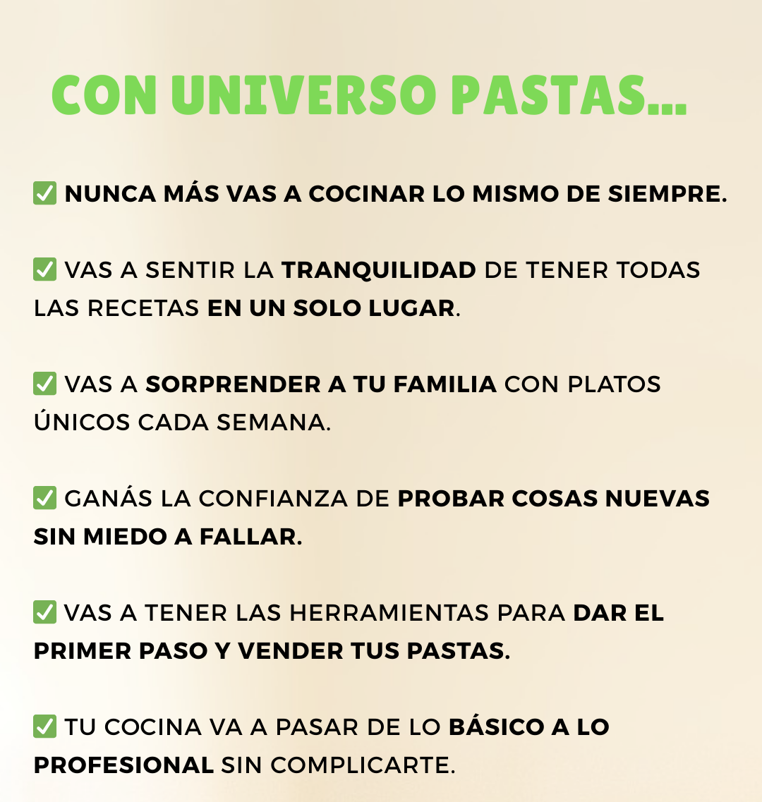 Si aplicás el paso a paso, podés estar vendiendo tus primeras pastas en menos de una semana. No es magia, es un sistema probado que simplifica y acelera el proceso.