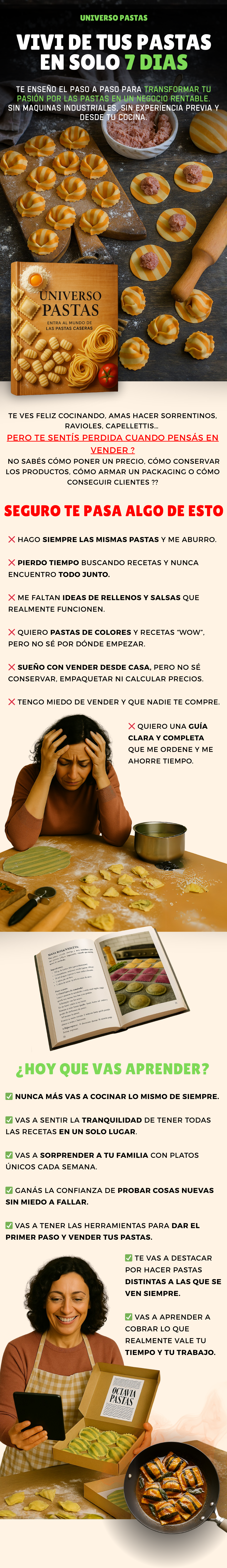 Sí, esa es la idea 🙌 Podés usar las recetas de ñoquis, sorrentinos, ravioles y masas de colores para emprender en tu barrio, vender por WhatsApp, en ferias, eventos o desde tu casa. En el material también vas a encontrar ideas para armar combos y presentaciones que te ayuden a cobrar mejor por cada bandeja.